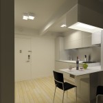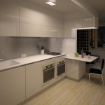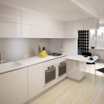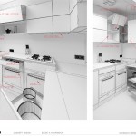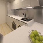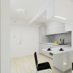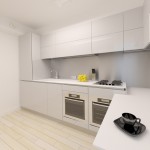 Старая кухня была слишком громоздкой, нефункциональной и не удовлетворяла владельца, который хотел получить лаконичную и эргономичную кухню, на которой можно готовить и есть вдвоем. Также, владельцу квартиры требовалось наличие всей бытовой техники: встроенный холодильник, микроволновая печь, духовка, варочная поверхность и измельчитель отходов. Все эти приборы интегрированы в белую глянцевую кухню, встроенную в нишу в стене. Компактный обеденный стол между гостиной и кухней освещен встроенными в верхние шкафы светильниками.