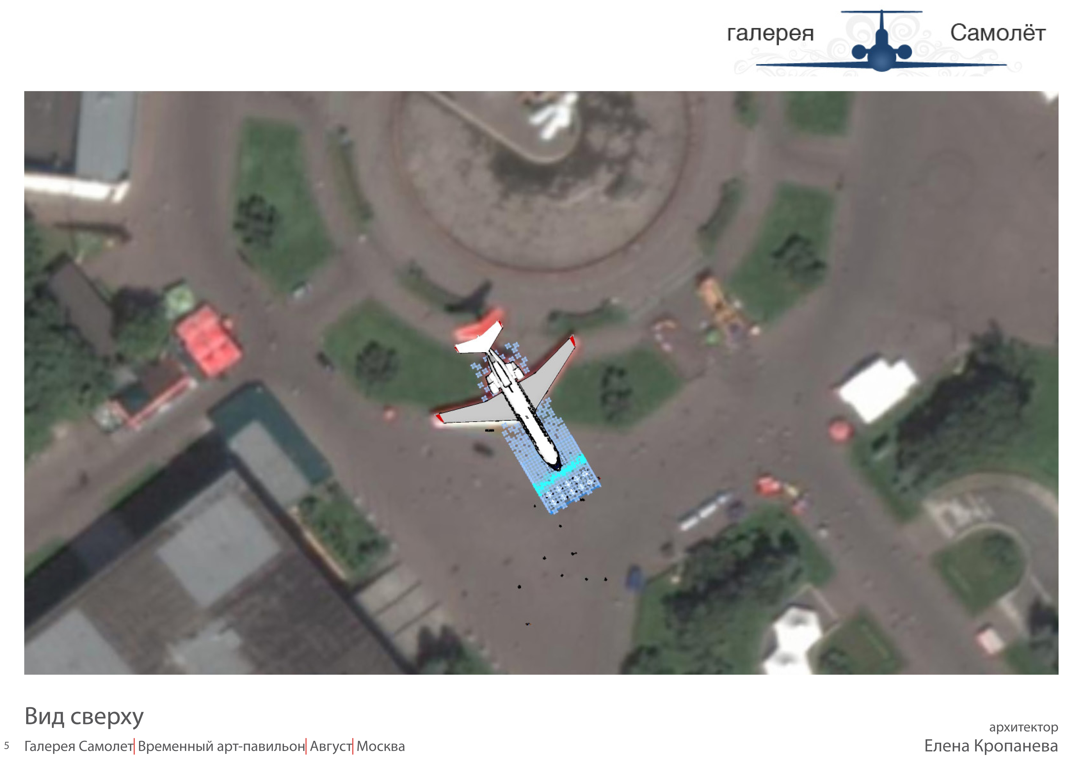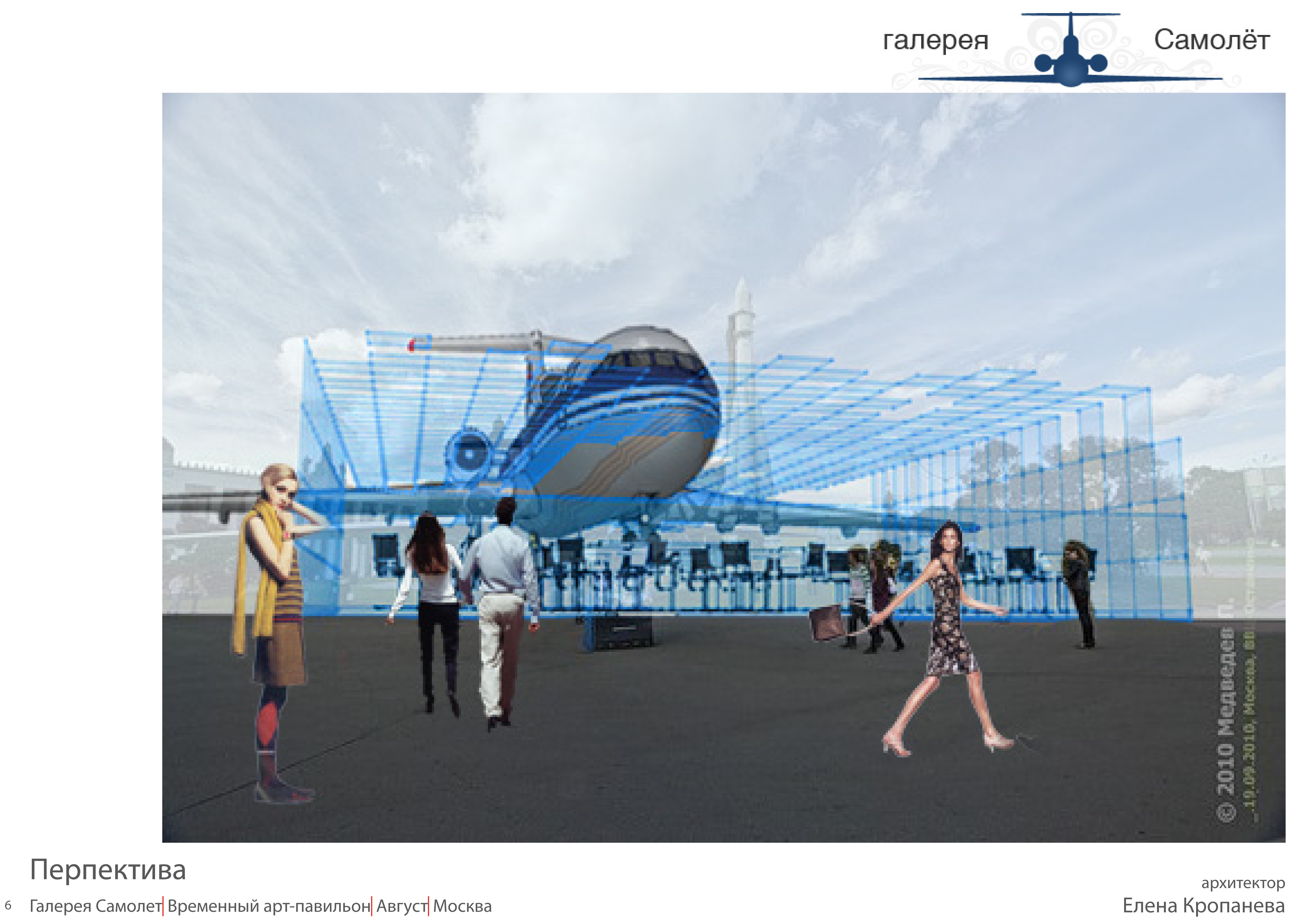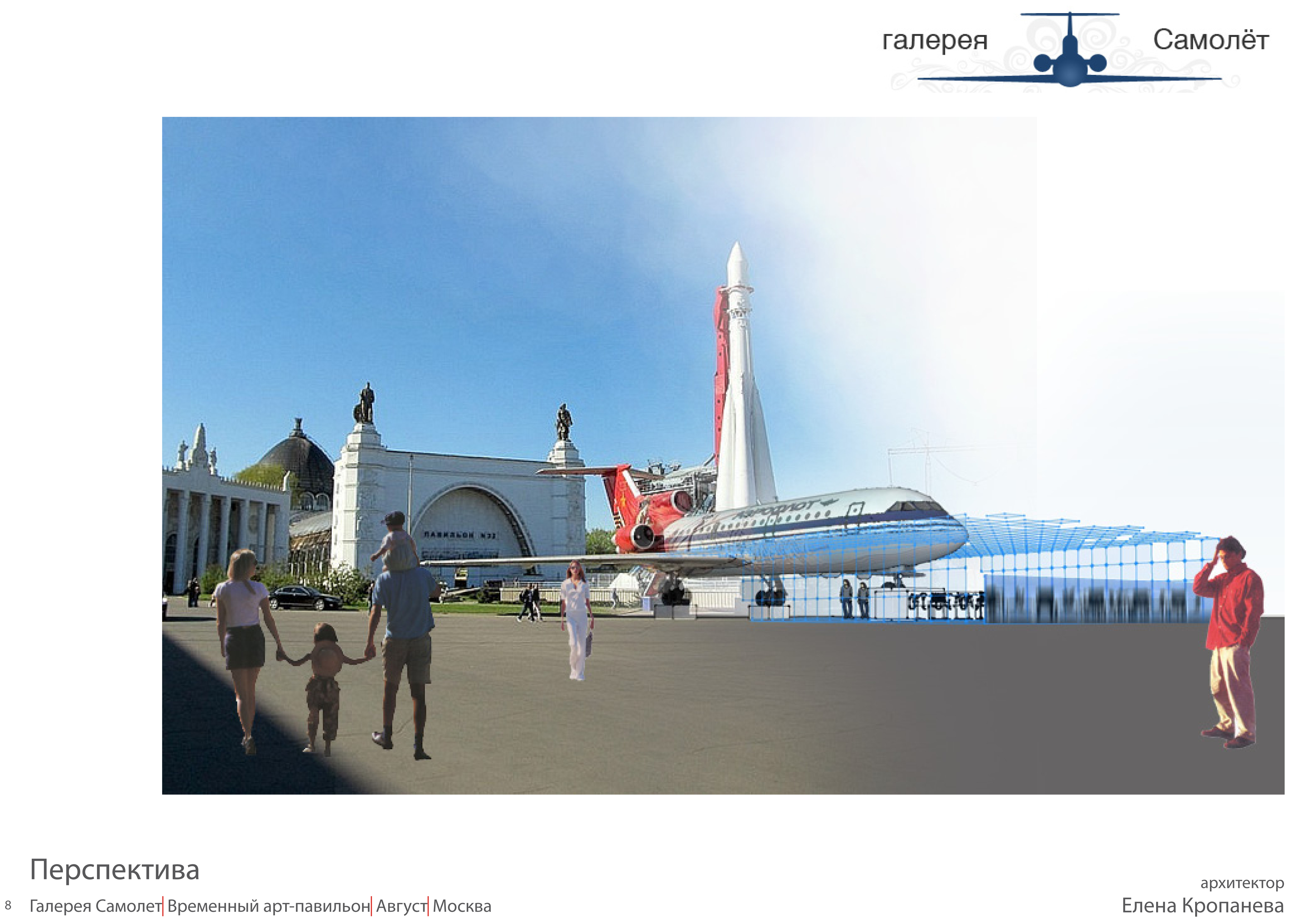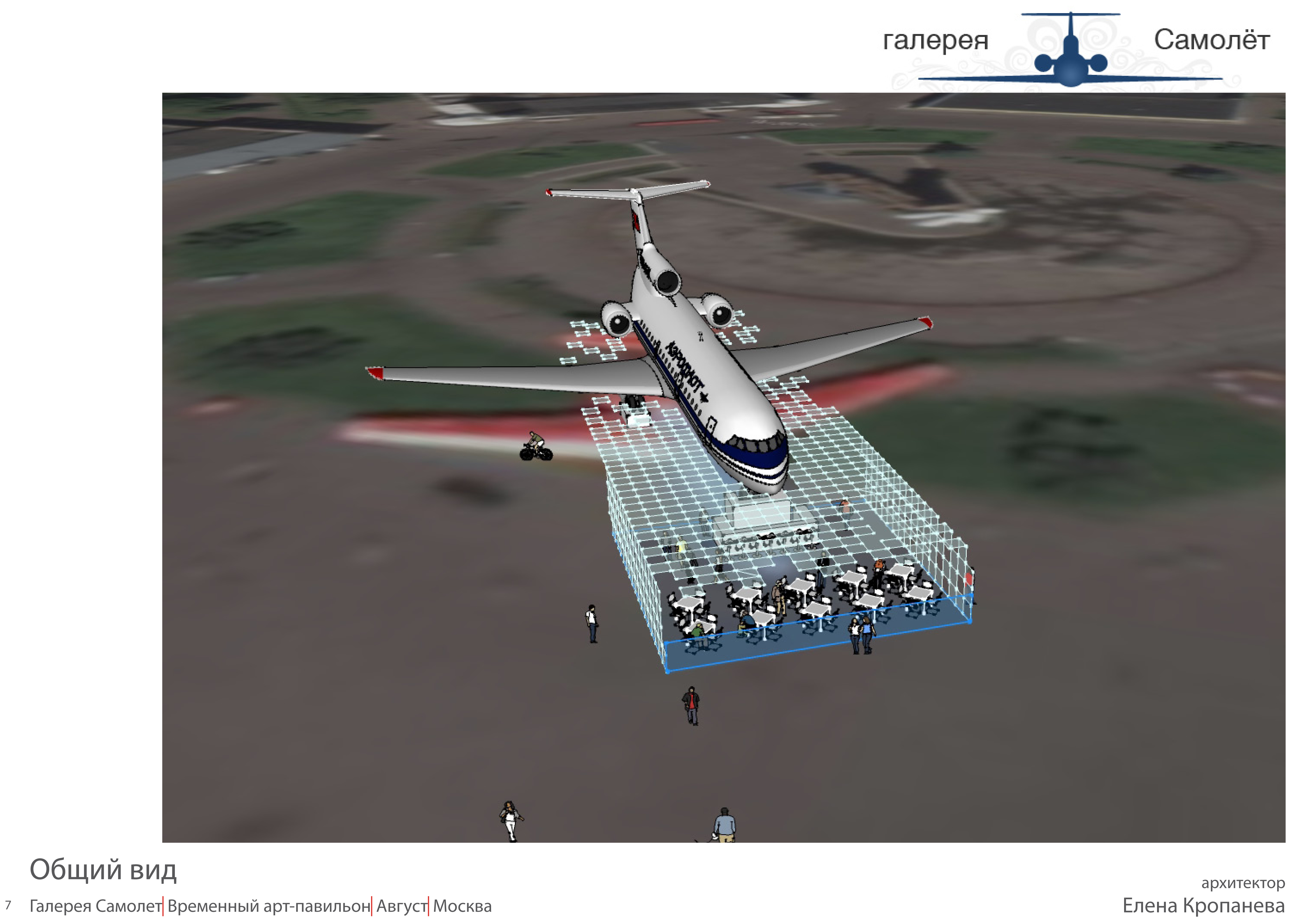 Арт-галерея САМОЛЕТ располагается в старом самолет Yak-42 на территории ВДНХ. Наброски изображают летнюю временную веранду с надувной крышей.
