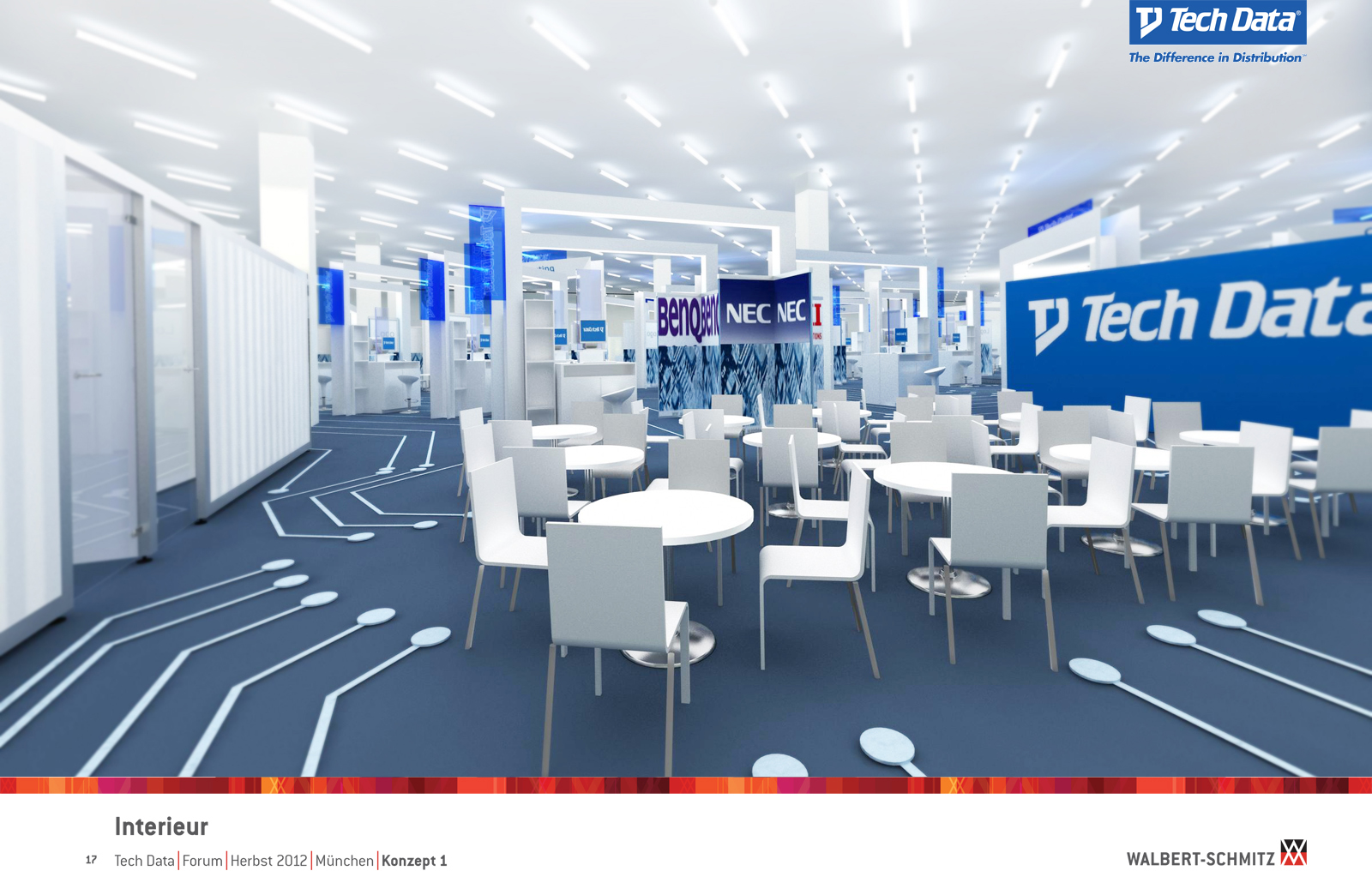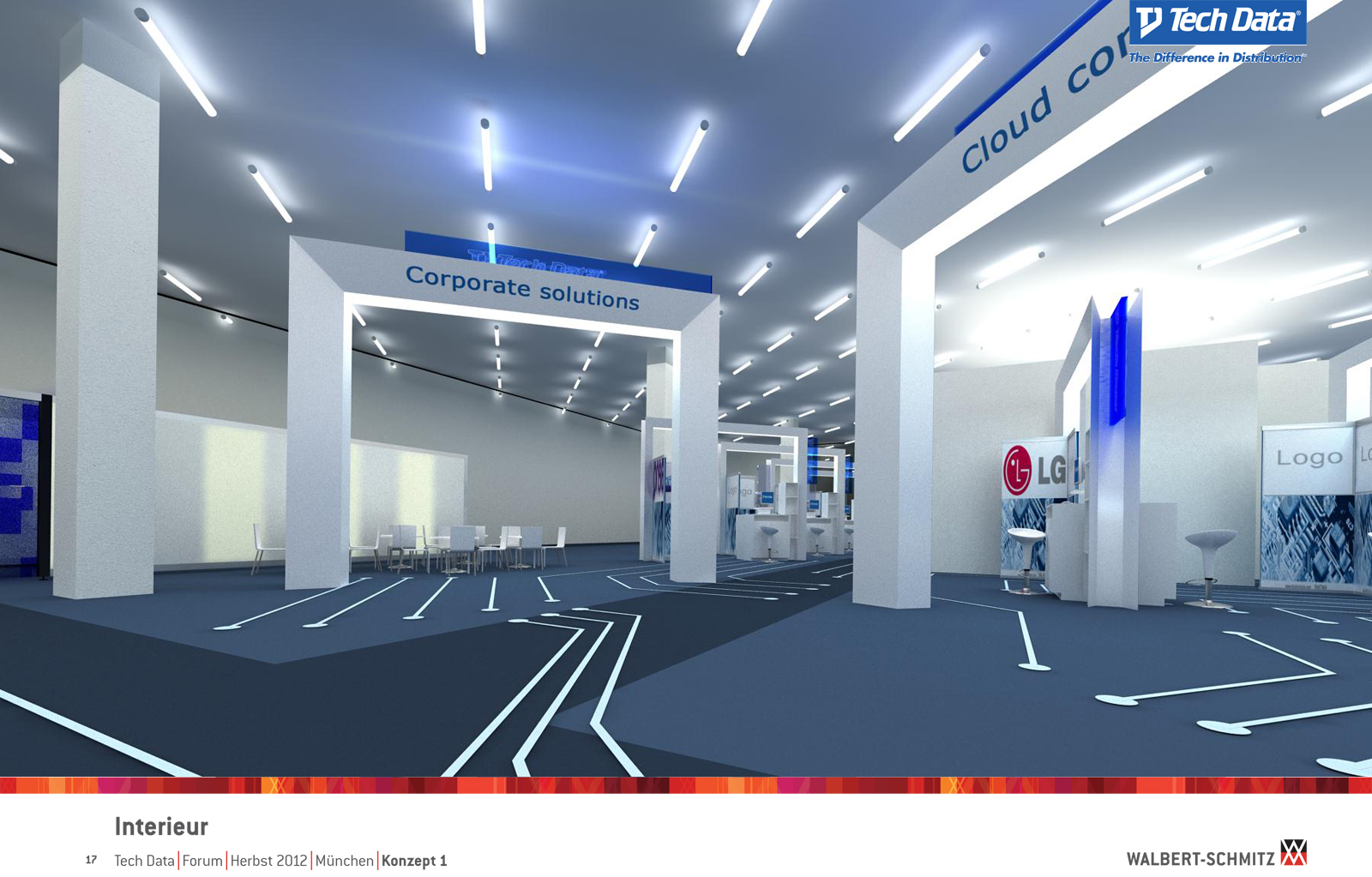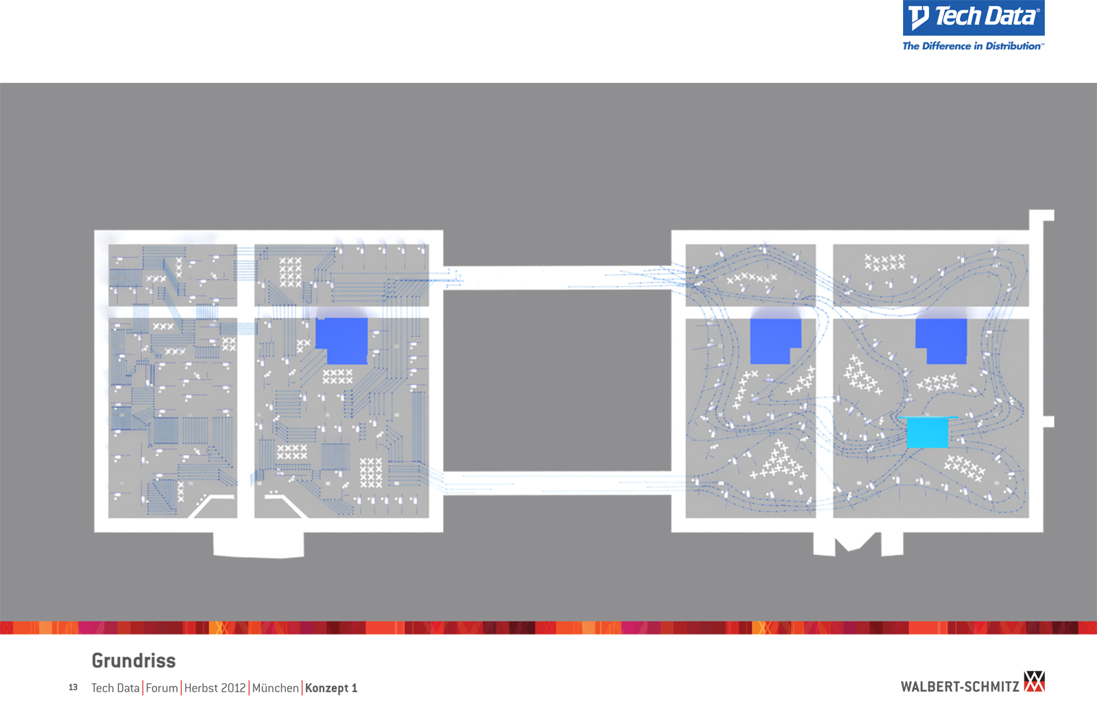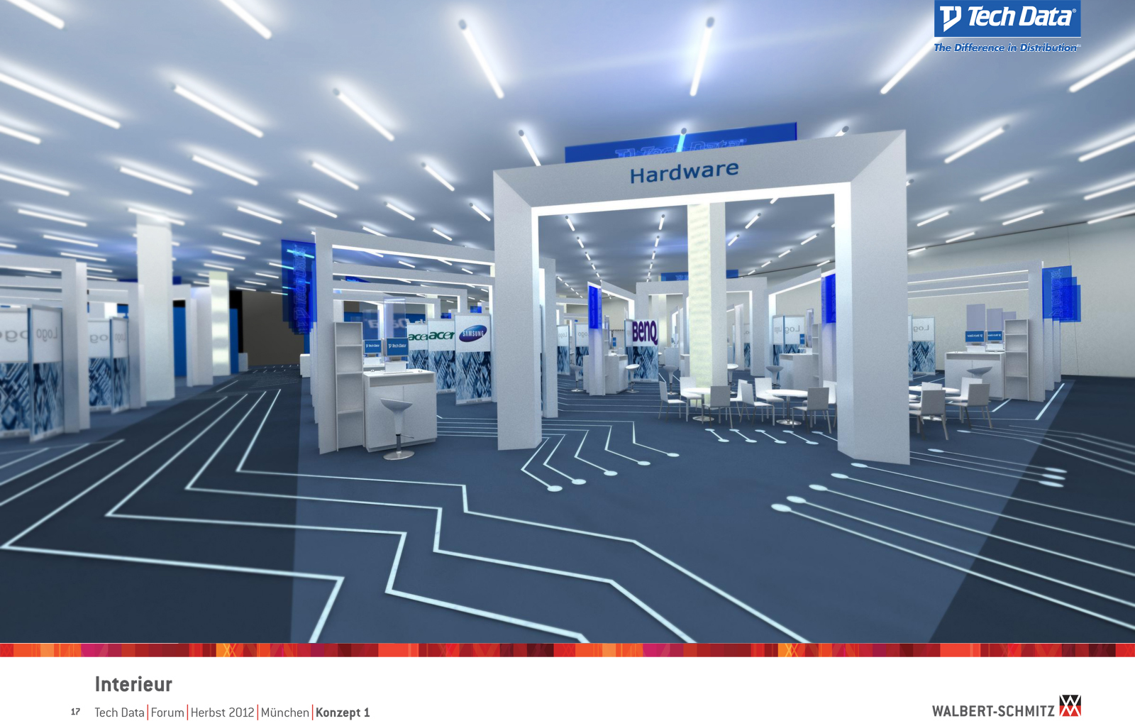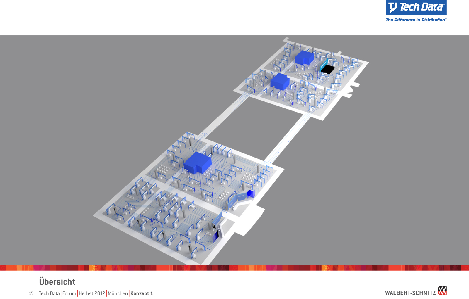 Каждый год Tech Data проводит ярмарку, включающую различные типа мероприятий, чтобы помочь розничным продавцам развиваться и расширить свою долю на рынке новых технологий, инноваций и бизнес-практик. В 2012 году в Мюнхене мероприятие располагалось в двух отдельных залах, связанных двумя коридорами. Это стало отправной точкой при создании дизайн-концепции. Дихотомия материального и нематериального, аппаратного и программного обеспечения, дня и ночи и т.д. легла в основу плана. Смешение и переход от одного к другому визуализированы на полу. Функциональными единицами стали модульные стандартные стенды, которые участники выставки могли арендовать у TechData. Стенды представляли собой арки со всем необходимым для арендатора: стойкой, местами для диалога, хранения буклетов и документов и местом для размещения логотипа. Таким образом, три типа стендов (размеры L, M и S) были объединены по группам согласно сферам деятельности, обозначенным большими арками. В пространстве выставки также разместились гардероб, переговорные комнаты, отдельные выставочные зоны для крупных брендов, сцена и т.д.