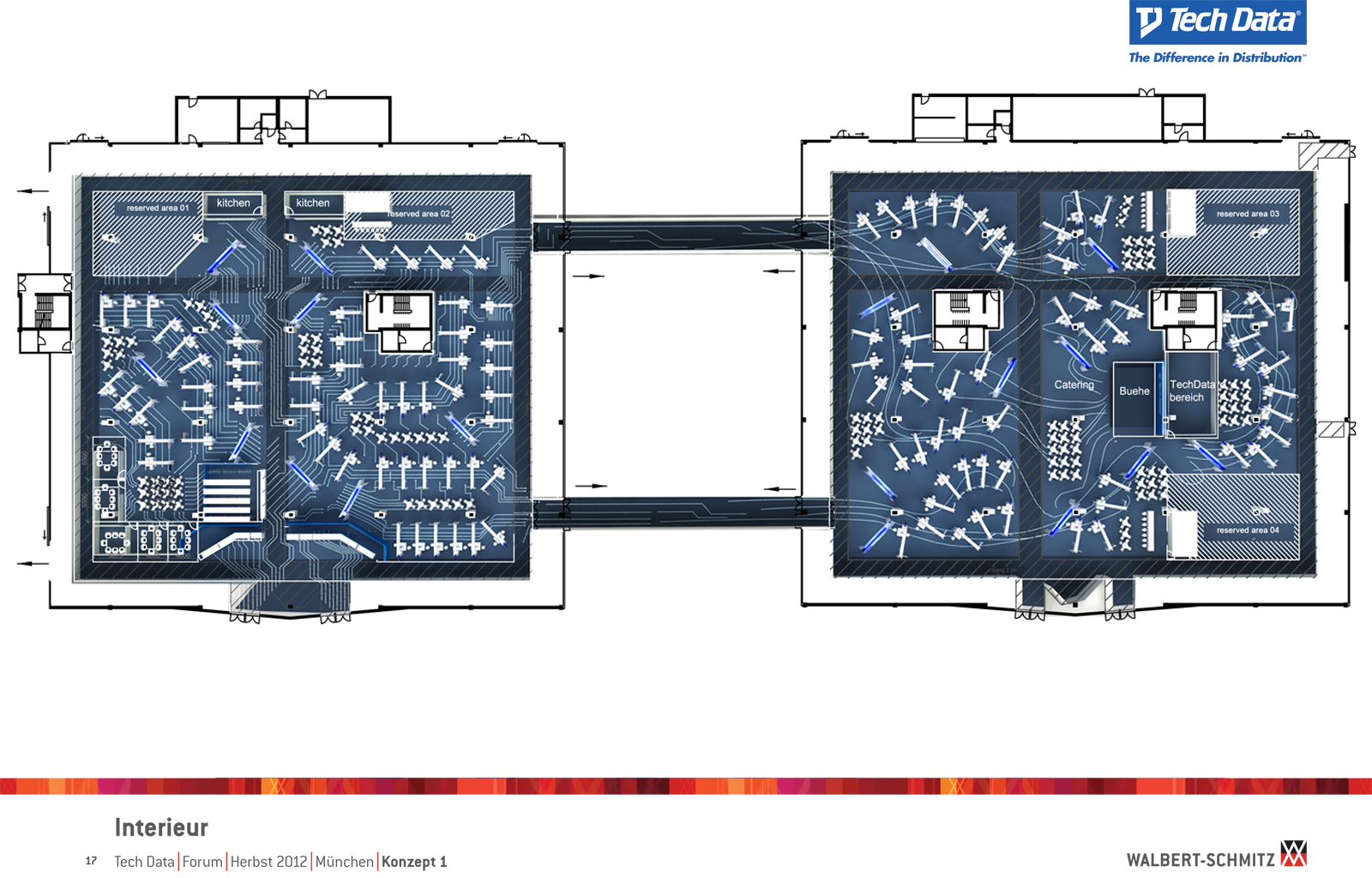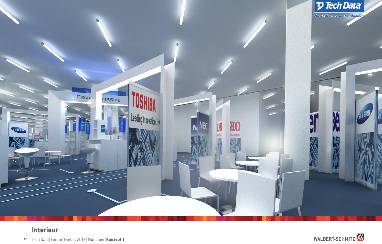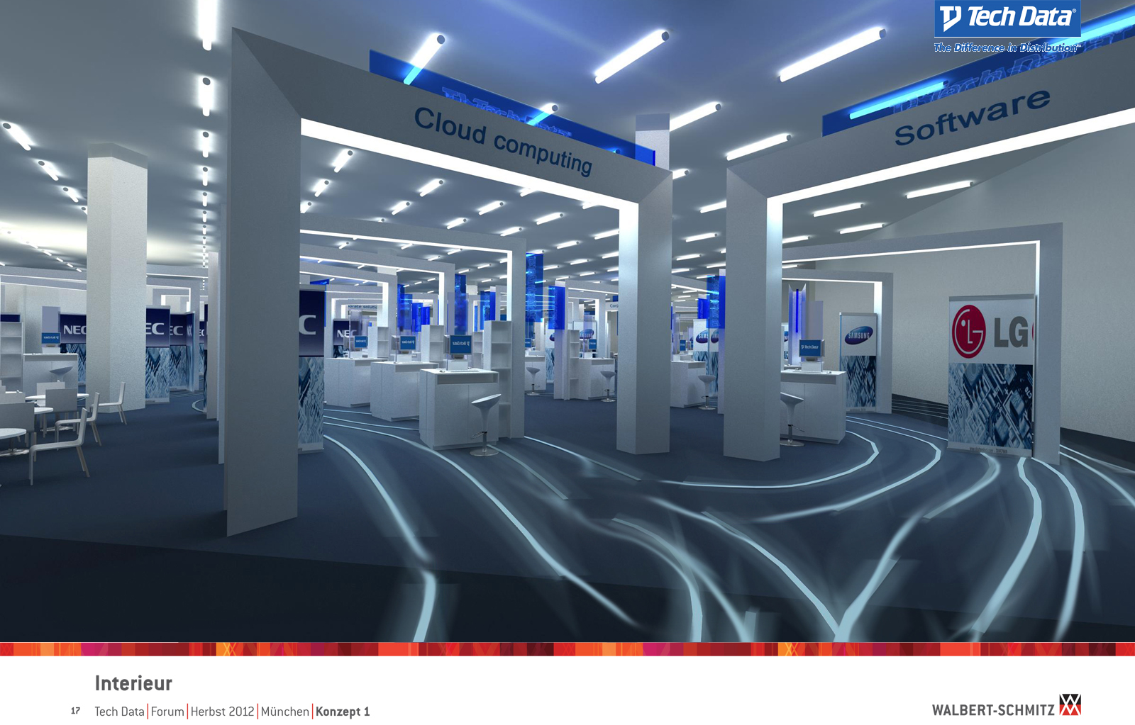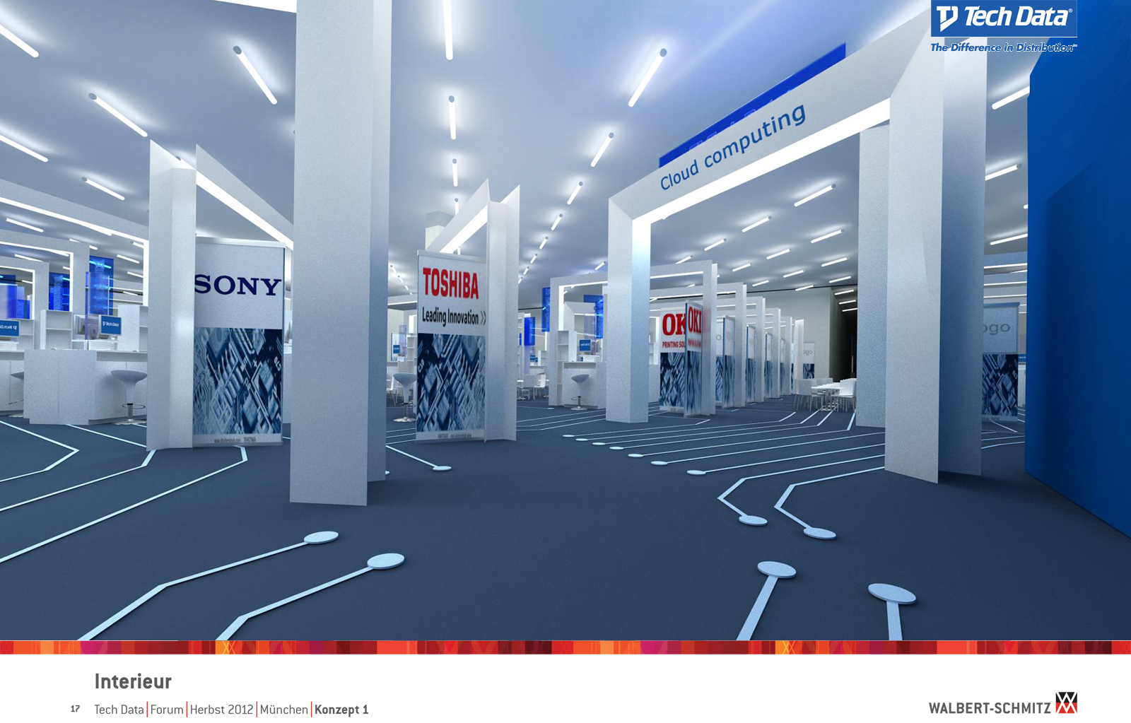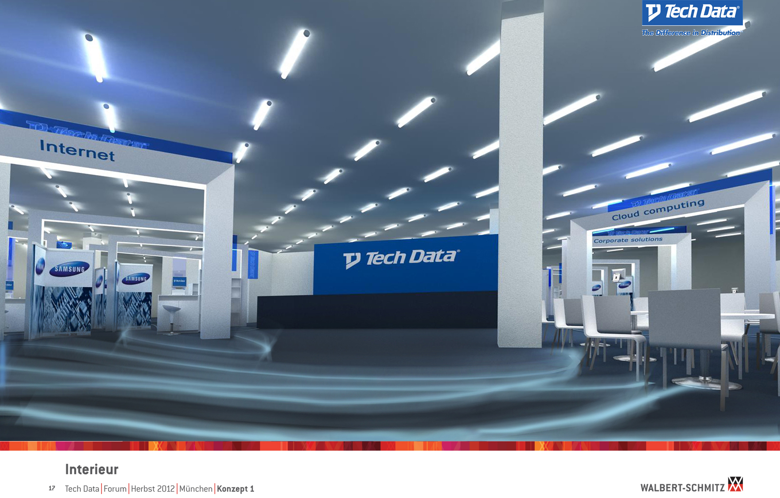 Каждый год Tech Data проводит ярмарку, включающую различные типа мероприятий, чтобы помочь розничным продавцам развиваться и расширить свою долю на рынке новых технологий, инноваций и бизнес-практик. В 2012 году в Мюнхене мероприятие располагалось в двух отдельных залах, связанных двумя коридорами. Это стало отправной точкой при создании дизайн-концепции. Дихотомия материального и нематериального, аппаратного и программного обеспечения, дня и ночи и т.д. легла в основу плана. Смешение и переход от одного к другому визуализированы на полу. Функциональными единицами стали модульные стандартные стенды, которые участники выставки могли арендовать у TechData. Стенды представляли собой арки со всем необходимым для арендатора: стойкой, местами для диалога, хранения буклетов и документов и местом для размещения логотипа. Таким образом, три типа стендов (размеры L, M и S) были объединены по группам согласно сферам деятельности, обозначенным большими арками. В пространстве выставки также разместились гардероб, переговорные комнаты, отдельные выставочные зоны для крупных брендов, сцена и т.д.