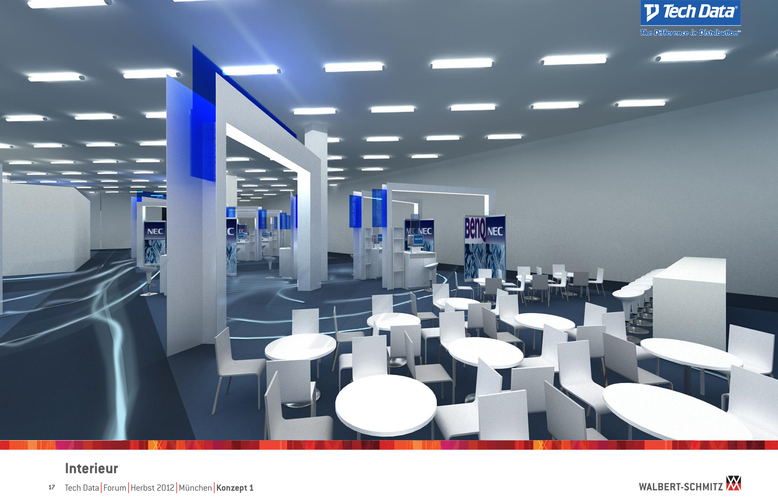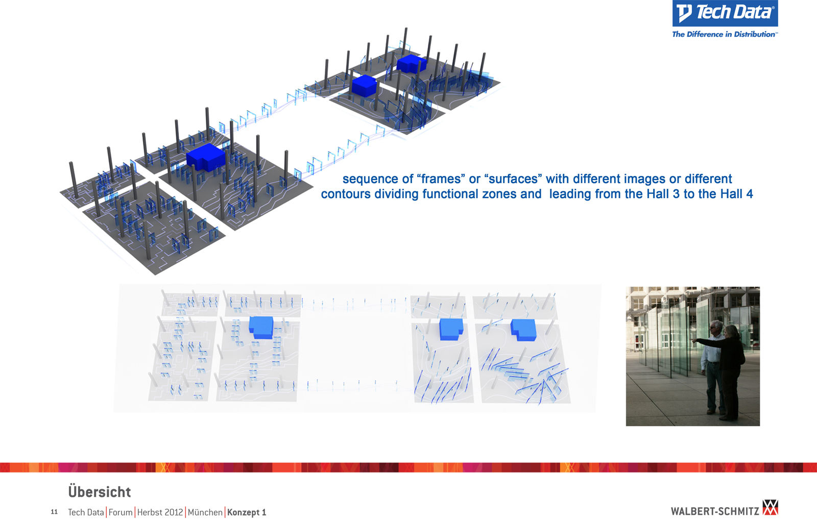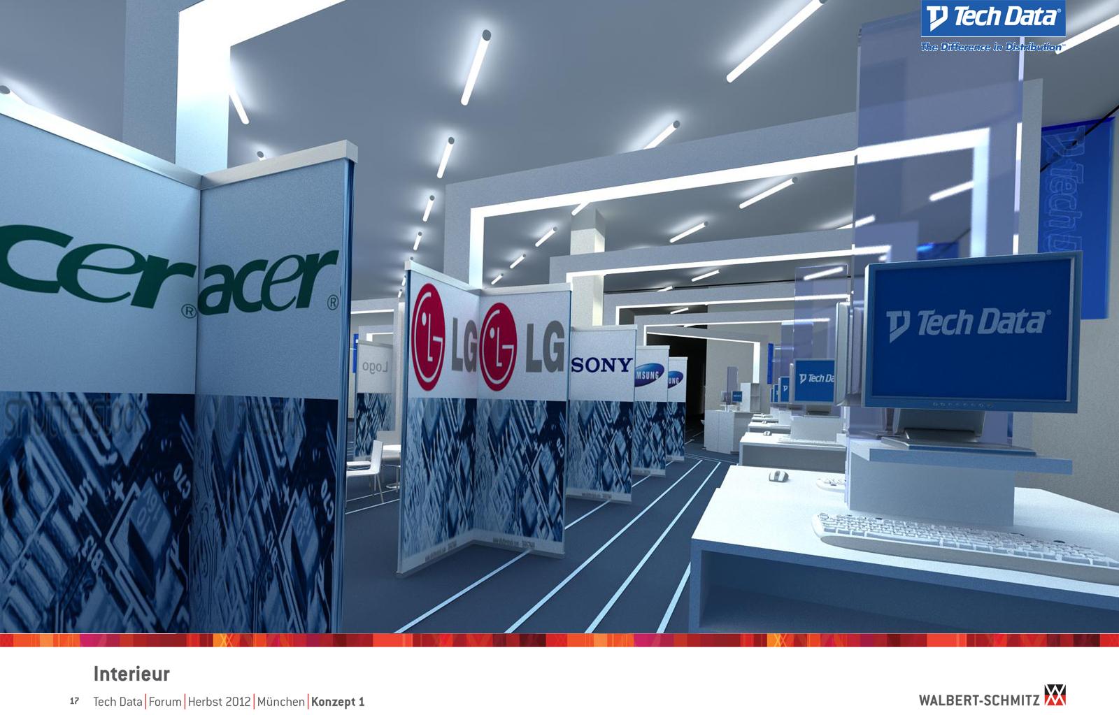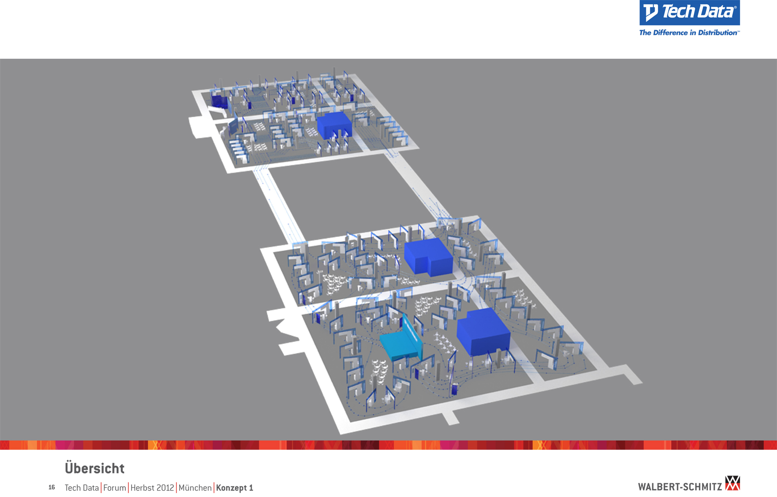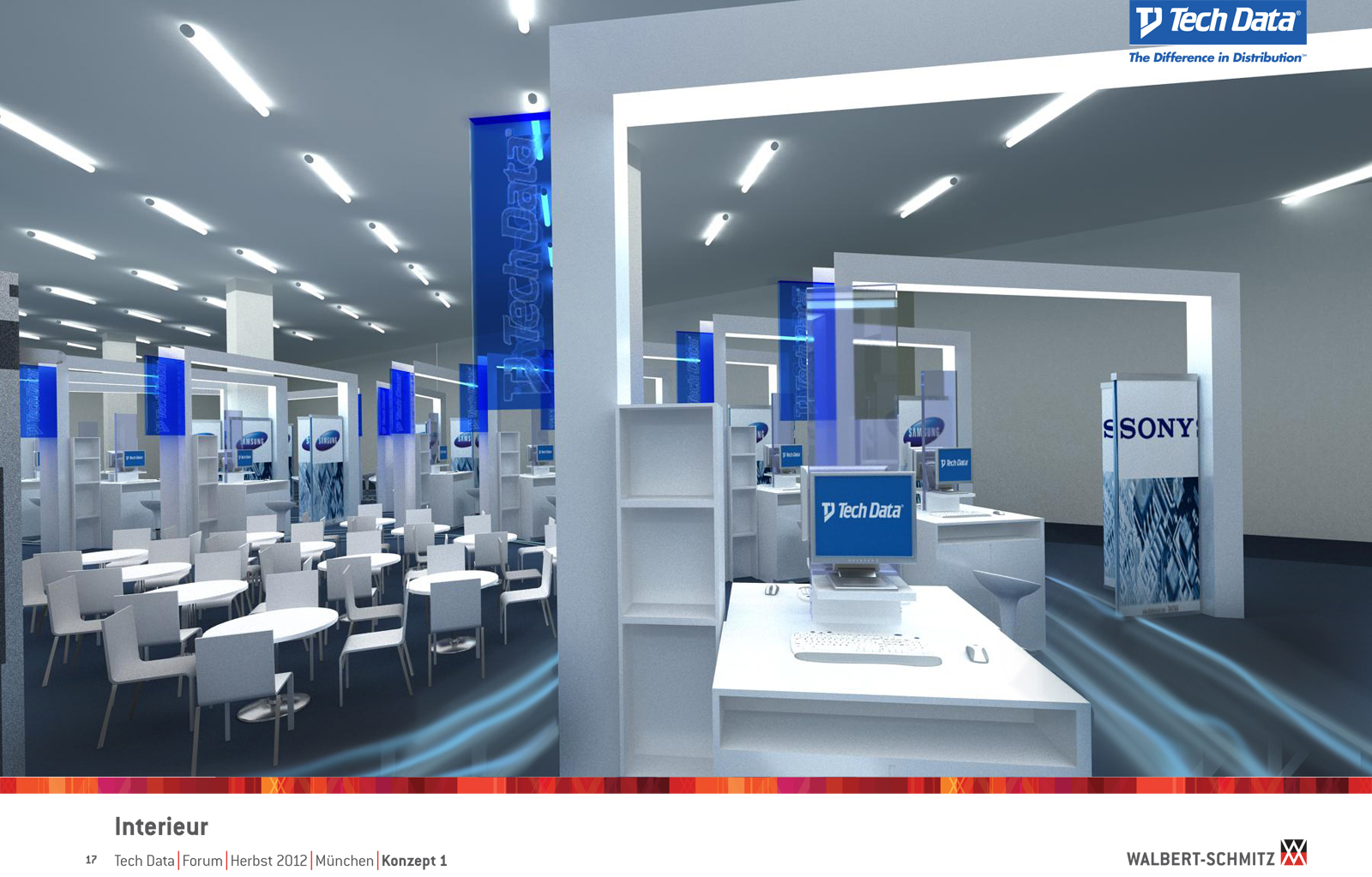 Каждый год Tech Data проводит ярмарку, включающую различные типа мероприятий, чтобы помочь розничным продавцам развиваться и расширить свою долю на рынке новых технологий, инноваций и бизнес-практик. В 2012 году в Мюнхене мероприятие располагалось в двух отдельных залах, связанных двумя коридорами. Это стало отправной точкой при создании дизайн-концепции. Дихотомия материального и нематериального, аппаратного и программного обеспечения, дня и ночи и т.д. легла в основу плана. Смешение и переход от одного к другому визуализированы на полу. Функциональными единицами стали модульные стандартные стенды, которые участники выставки могли арендовать у TechData. Стенды представляли собой арки со всем необходимым для арендатора: стойкой, местами для диалога, хранения буклетов и документов и местом для размещения логотипа. Таким образом, три типа стендов (размеры L, M и S) были объединены по группам согласно сферам деятельности, обозначенным большими арками. В пространстве выставки также разместились гардероб, переговорные комнаты, отдельные выставочные зоны для крупных брендов, сцена и т.д.