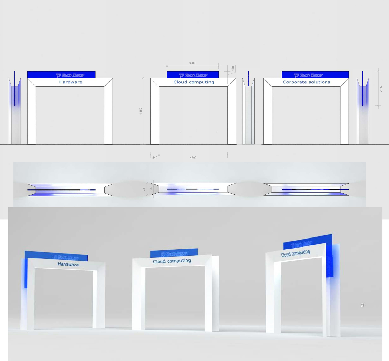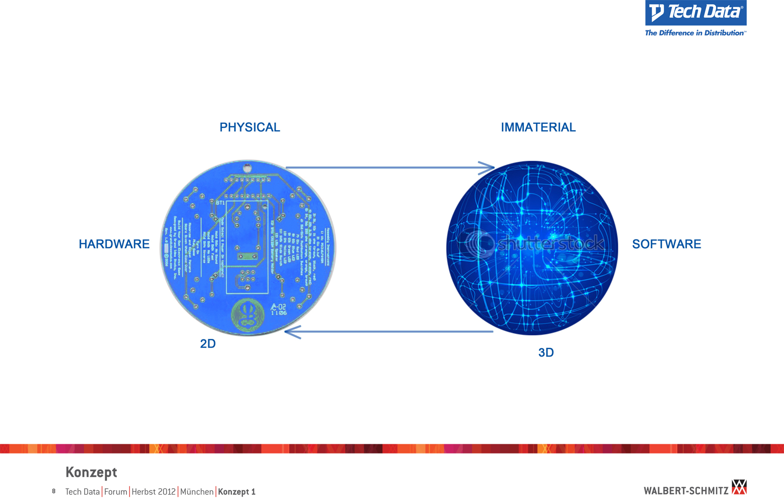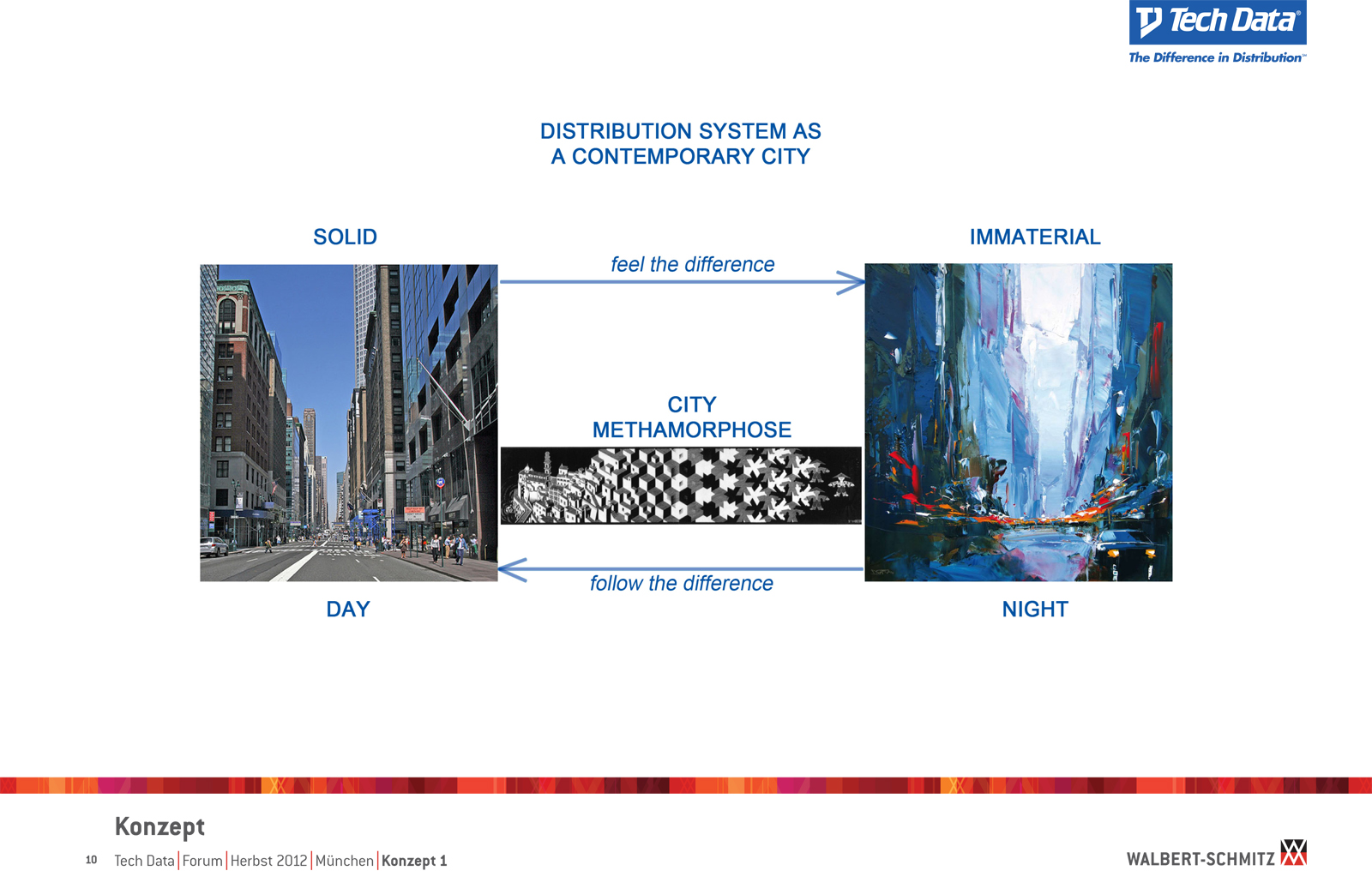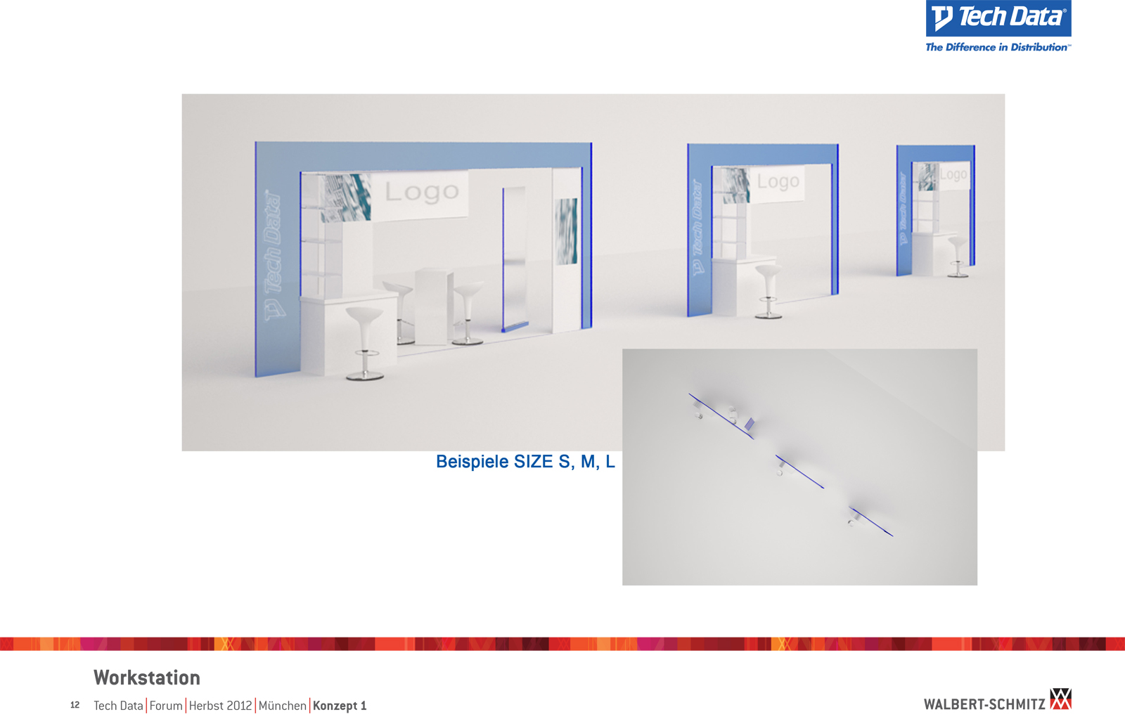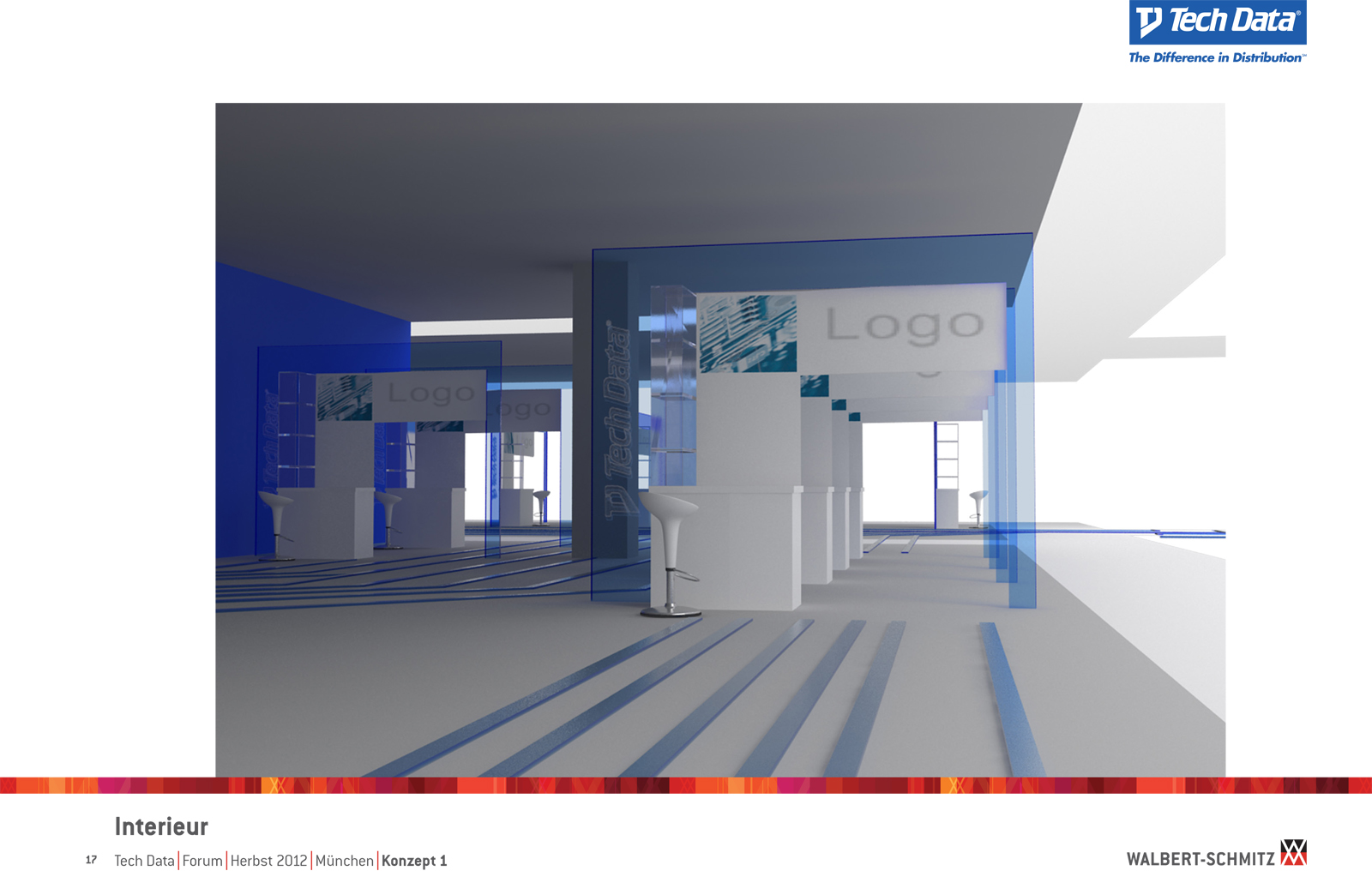 Каждый год Tech Data проводит ярмарку, включающую различные типа мероприятий, чтобы помочь розничным продавцам развиваться и расширить свою долю на рынке новых технологий, инноваций и бизнес-практик. В 2012 году в Мюнхене мероприятие располагалось в двух отдельных залах, связанных двумя коридорами. Это стало отправной точкой при создании дизайн-концепции. Дихотомия материального и нематериального, аппаратного и программного обеспечения, дня и ночи и т.д. легла в основу плана. Смешение и переход от одного к другому визуализированы на полу. Функциональными единицами стали модульные стандартные стенды, которые участники выставки могли арендовать у TechData. Стенды представляли собой арки со всем необходимым для арендатора: стойкой, местами для диалога, хранения буклетов и документов и местом для размещения логотипа. Таким образом, три типа стендов (размеры L, M и S) были объединены по группам согласно сферам деятельности, обозначенным большими арками. В пространстве выставки также разместились гардероб, переговорные комнаты, отдельные выставочные зоны для крупных брендов, сцена и т.д.