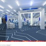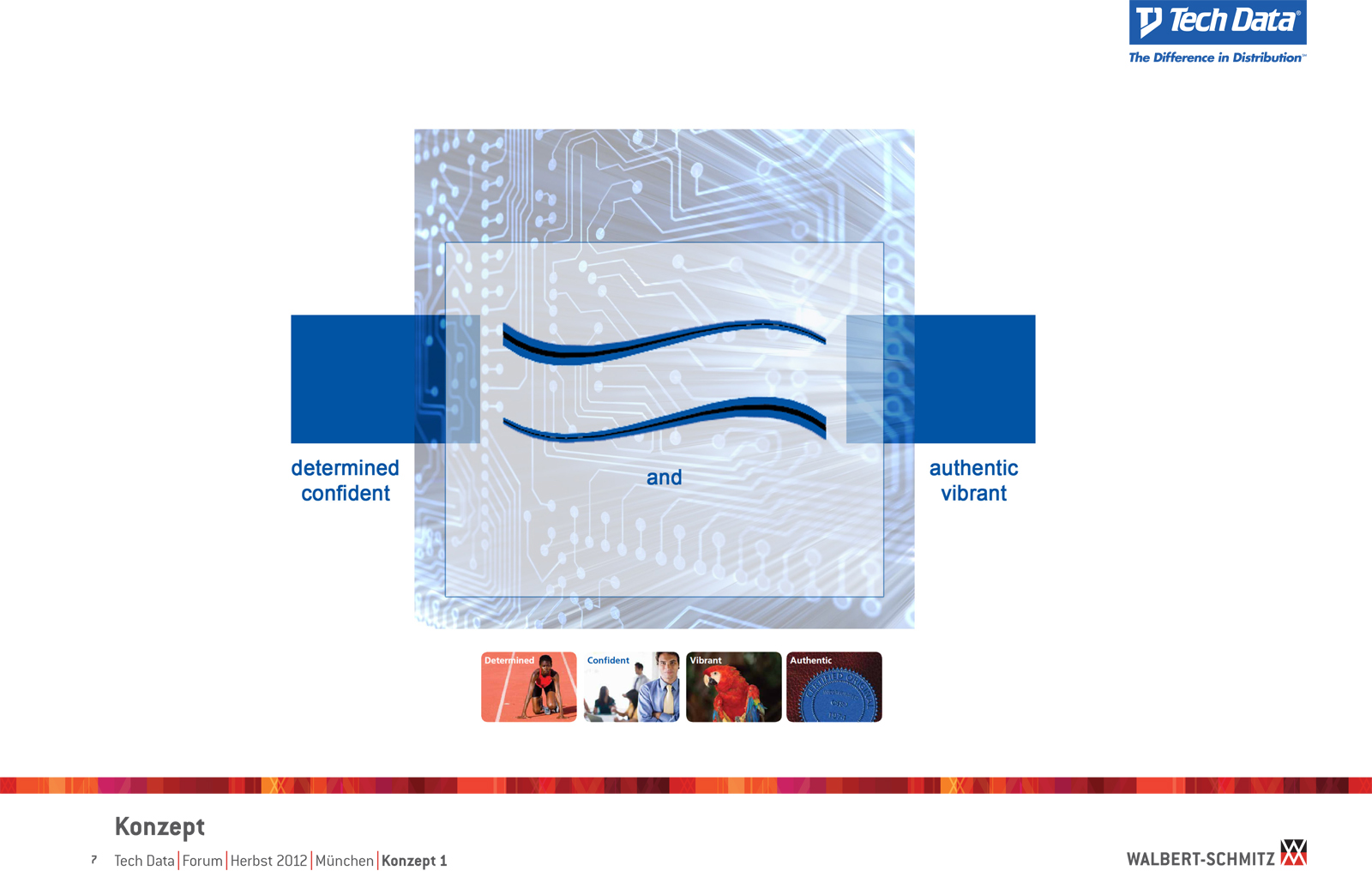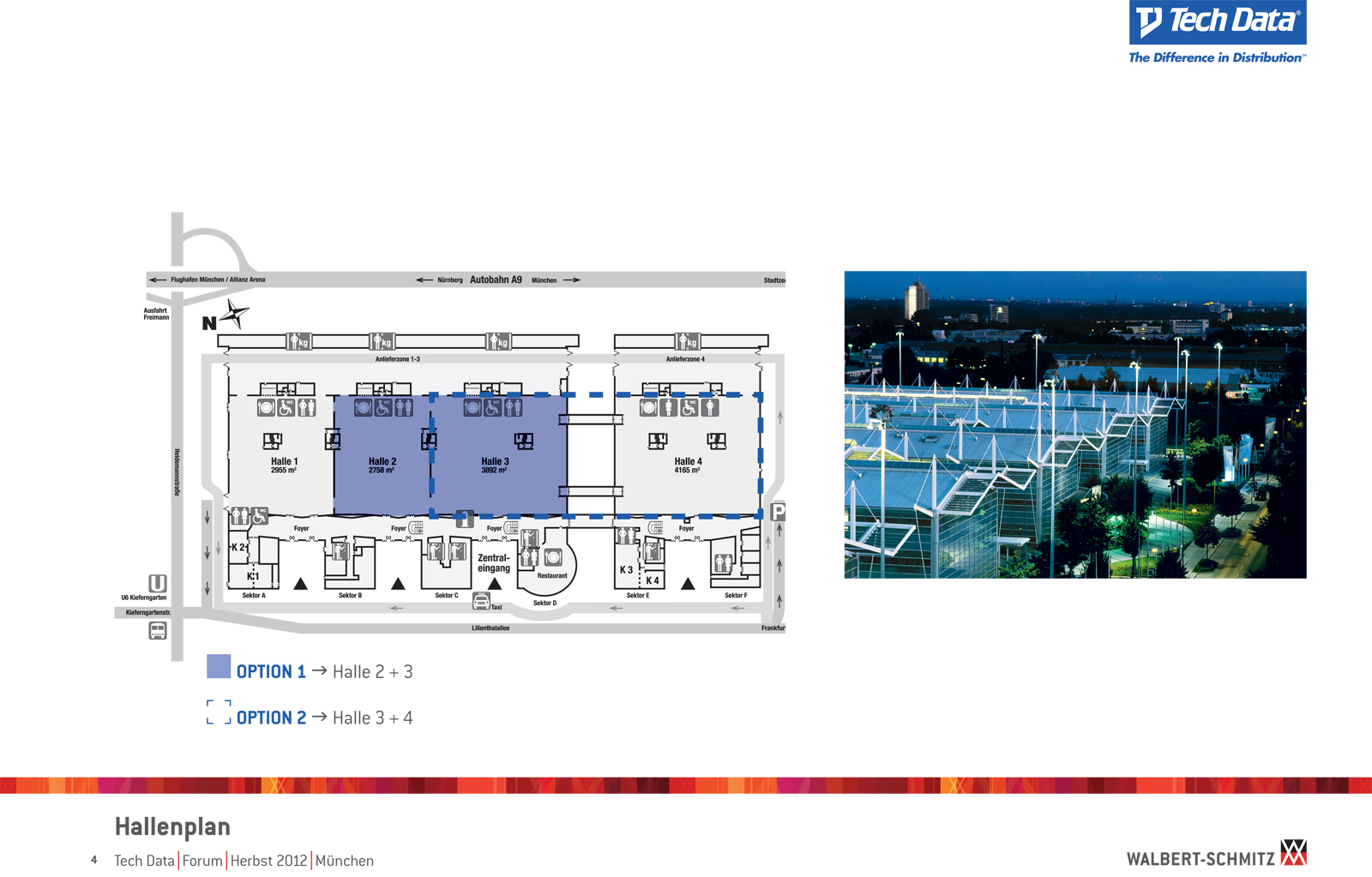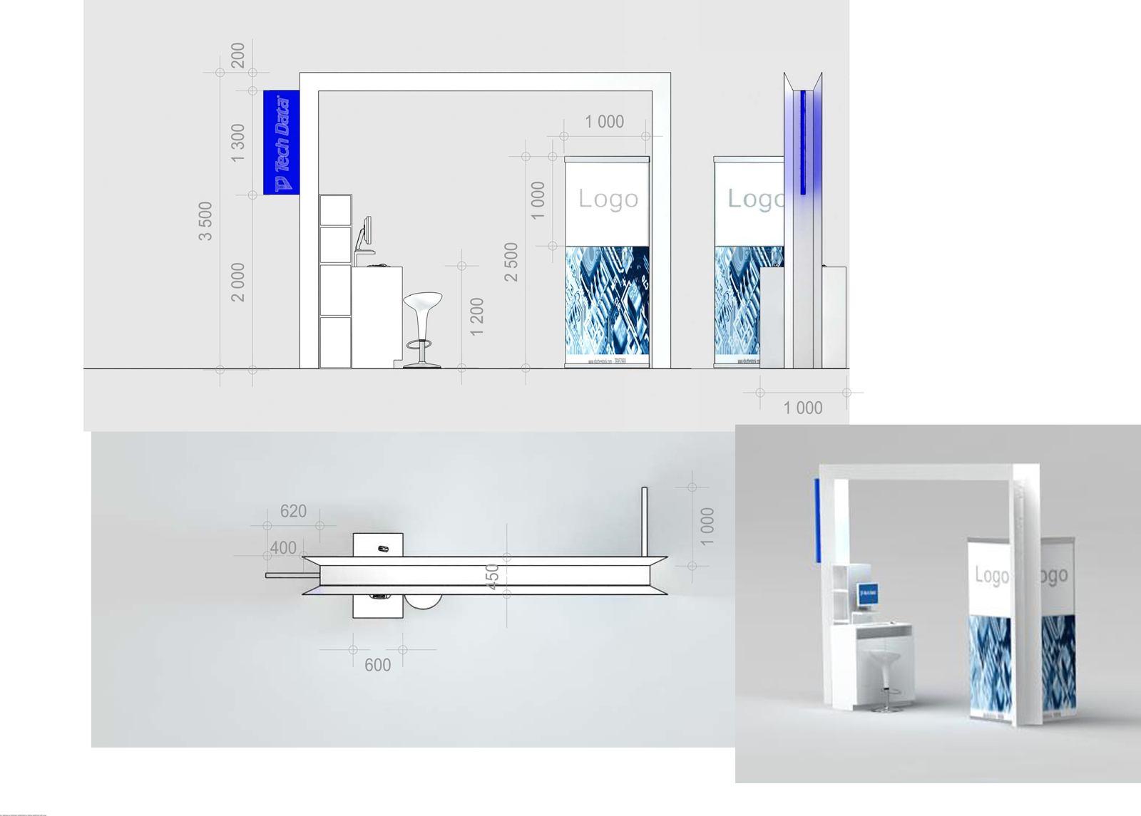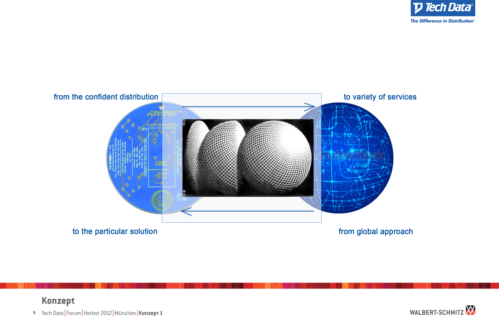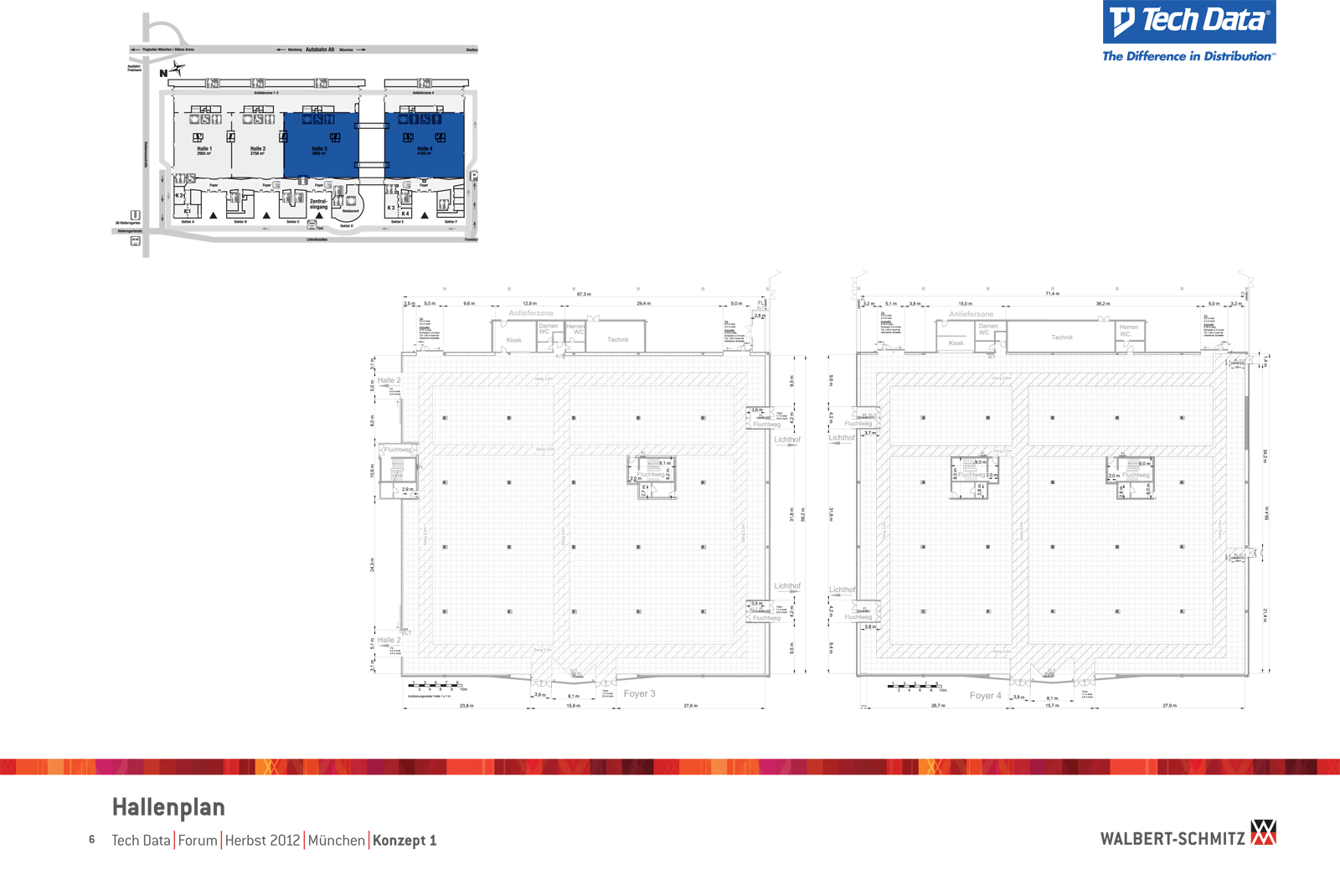 Каждый год Tech Data проводит ярмарку, включающую различные типа мероприятий, чтобы помочь розничным продавцам развиваться и расширить свою долю на рынке новых технологий, инноваций и бизнес-практик. В 2012 году в Мюнхене мероприятие располагалось в двух отдельных залах, связанных двумя коридорами. Это стало отправной точкой при создании дизайн-концепции. Дихотомия материального и нематериального, аппаратного и программного обеспечения, дня и ночи и т.д. легла в основу плана. Смешение и переход от одного к другому визуализированы на полу. Функциональными единицами стали модульные стандартные стенды, которые участники выставки могли арендовать у TechData. Стенды представляли собой арки со всем необходимым для арендатора: стойкой, местами для диалога, хранения буклетов и документов и местом для размещения логотипа. Таким образом, три типа стендов (размеры L, M и S) были объединены по группам согласно сферам деятельности, обозначенным большими арками. В пространстве выставки также разместились гардероб, переговорные комнаты, отдельные выставочные зоны для крупных брендов, сцена и т.д.